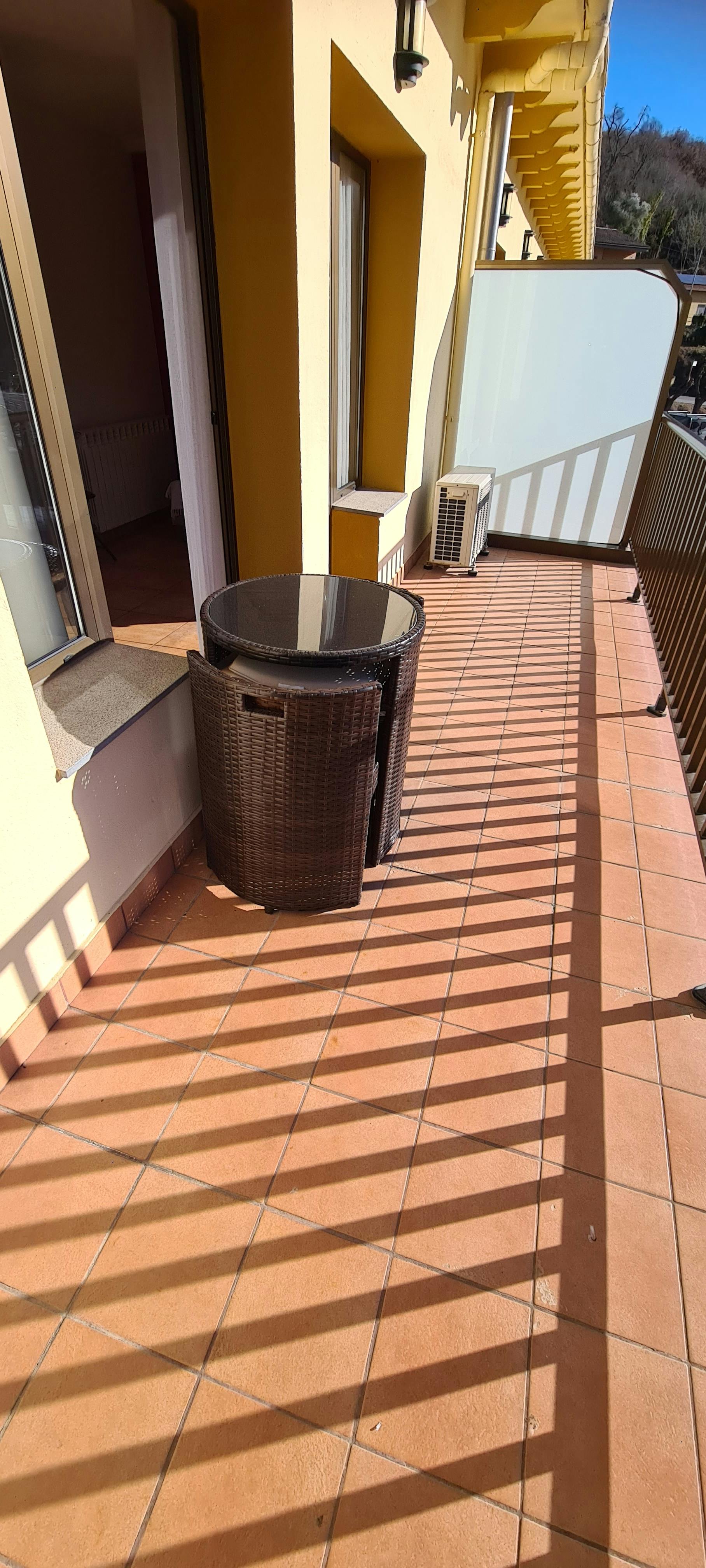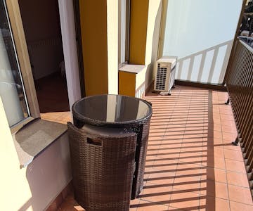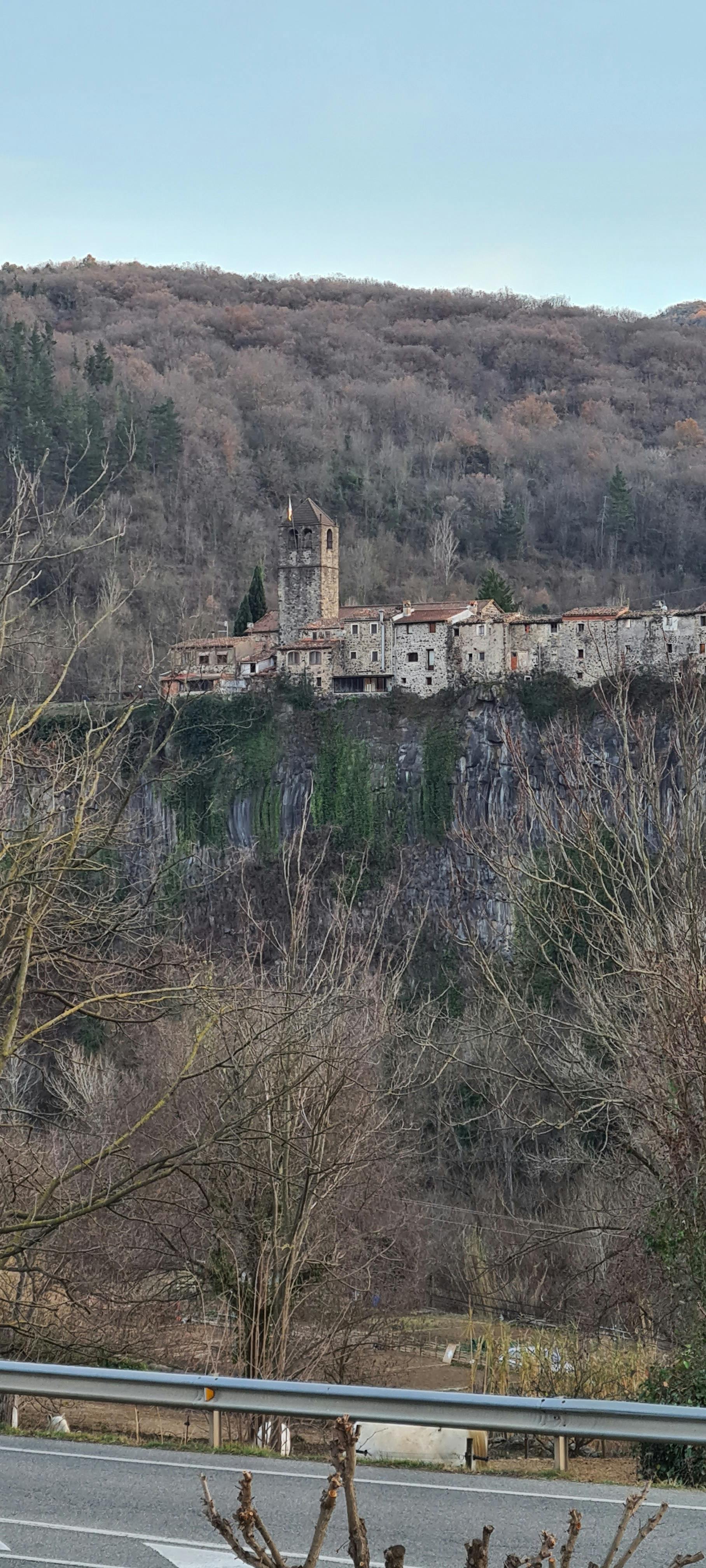 Habitacion con cama doble i terraza particular con vistas al arisco de castellfollit de la roca, aire acondicionado, tv ,calefación , secador de pelo , caja fuerte ,baño completo con bañera.